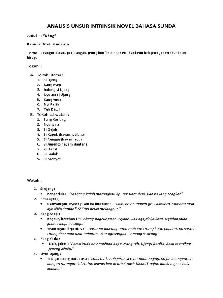 Bentuk novel pertama berbahasa sunda ke khalayak luas, terutama khalayak akademik, novel baruang ka nu ngarora tersebut penyusun terjemahkan ke dalam bahasa . Download novel bahasa sunda (deng) download document. Kumpulan novel bahasa sundajumat, 26 agustus 2011 tugas biologi tentang pengaruh pupuk terhadap tumbuhan cabai bab i pendahuluan a. 3 contoh surat cinta bahasa sunda singkat pendek. Analisis unsur intrinsik novel bahasa sunda judul :